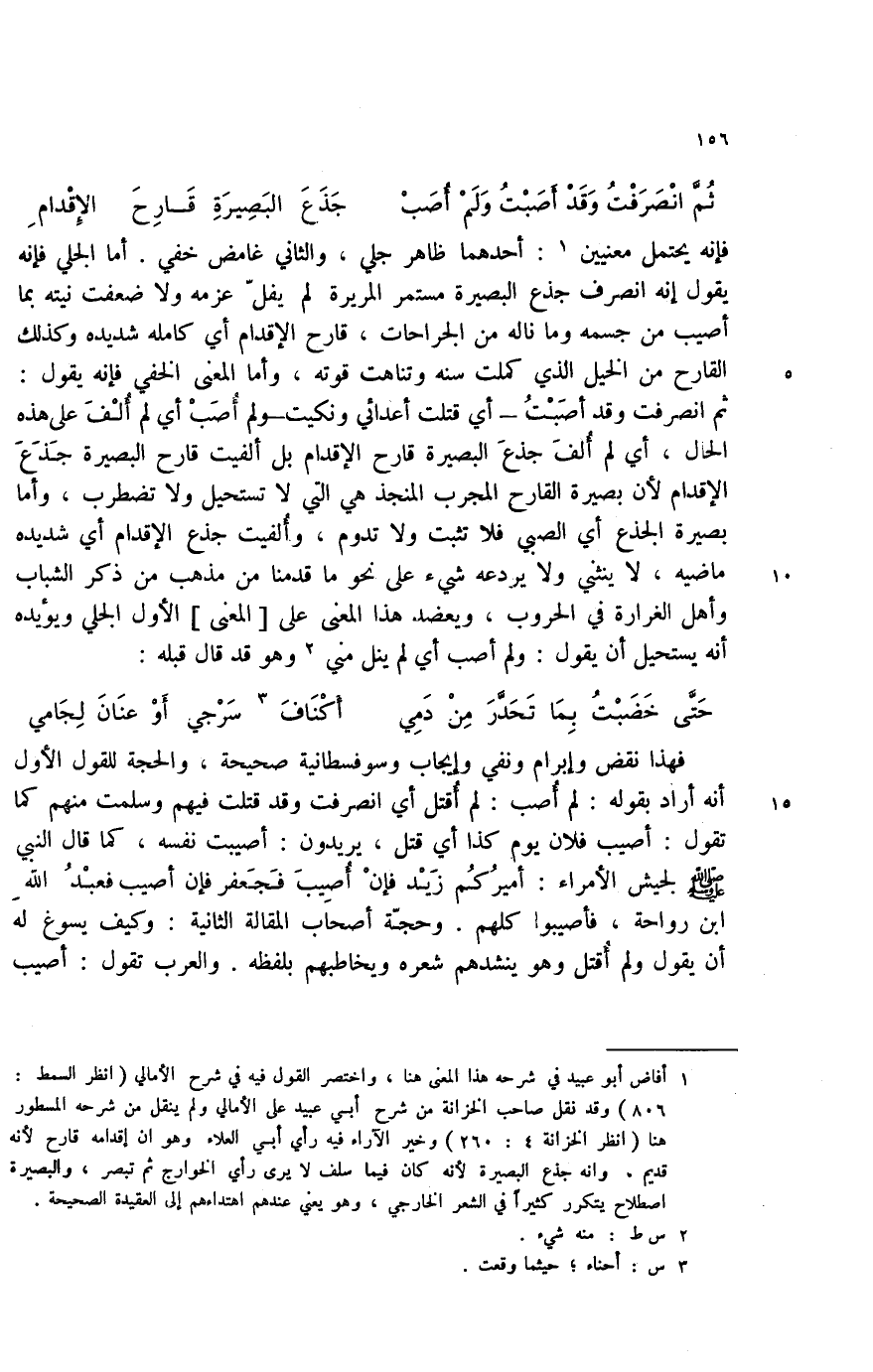 (1) أفاض أبو عبيد في شرحه هذا المعنى هنا، واختصر القول فيه شرح الأماني (انظر السمط: 806) وقد نقل صاحب الخزانة من شرح أبي عبيد على الأمالي ولم ينقل من شرحه المسطور هنا (انظر الخزانة 4: 260) وخير الآراء فيه رأي أبي العلاء وهو إن إقدامه قارح لأنه قديم، وإنه جذع البصيرة لأنه كان فيما سلف لا يرى رأي الخوارج ثم تبصر، والبصيرة اصطلاح يتكرر كثيراً في الشعر الخارجي، وهو يعني عندهم اهتداءهم إلى العقيدة الصحيحة.