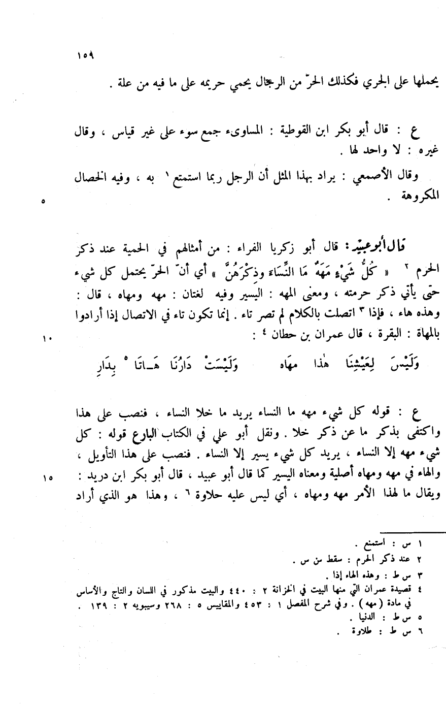 قال أبو عبيد: قال أبو زكريا الفراء: من أمثالهم في الحمية عند ذكر الحرم (2) " كل شيءٍ مهه ما النساء وذكرهن " أي أن الحر يحتمل كل شيء حتى يأتي ذكر حرمته، ومعنى المهه: اليسير وفيه لغتان: مهه ومهاه، قال: وهذه هاء، فإذا (3) اتصلت بالكلام لم تصر تاء. إنما تكون تاء في الاتصال إذا أرادوا بالمهاة: البقرة، قال عمران بن حطان (4) :