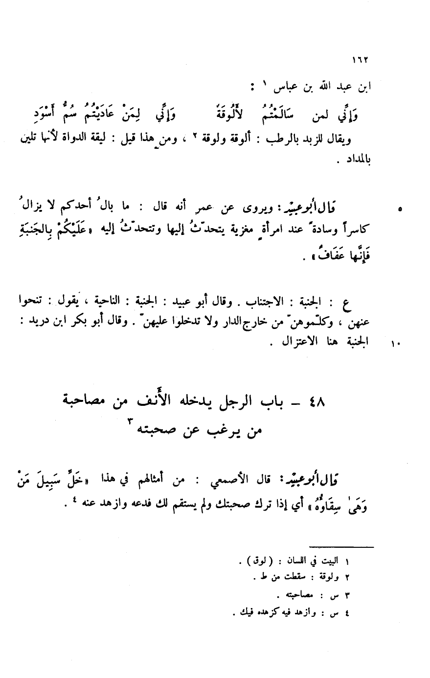 قال أبو عبيد: ويروى عن عمر أنه قال: ما بال أحدكم لا يزال كاسراً وسادةً عند امرأة مغزية يتحدث إليها وتتحدث إليه " عليكم بالجنبة فإنها عفاف ".