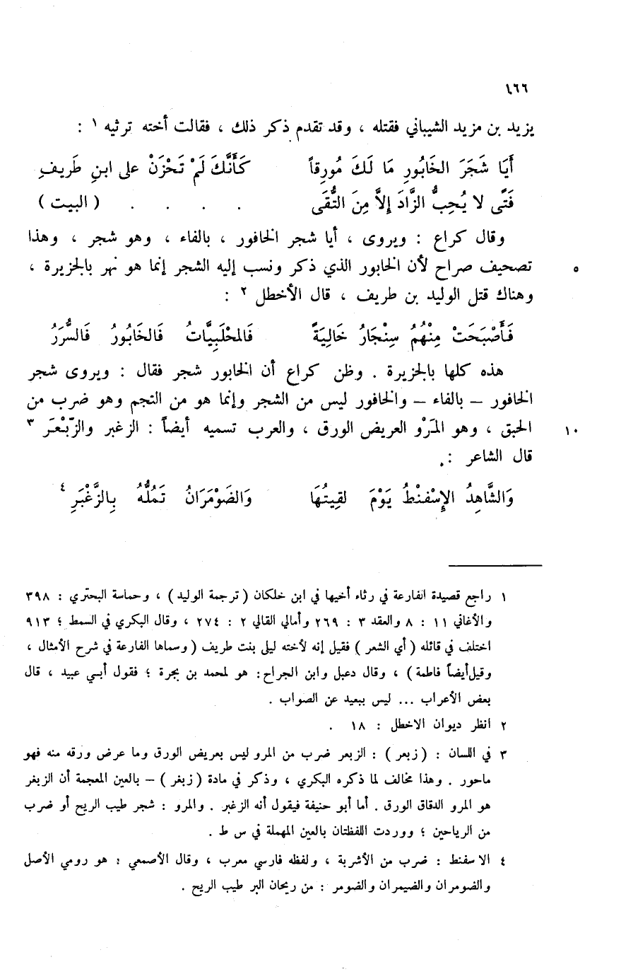 فتى لا يحب الزاد إلا من التقى ... ................. (البيت) وقال كراع: ويروى، أيا شجر الخافور، بالفاء، وهو شجر، وهذا تصحيف صراح لأن الخابور الذي ذكر ونسب إليه الشجر إنما هو نهر بالجزيرة، وهناك قتل الوليد بن طريف، قال الأخطل (2) :