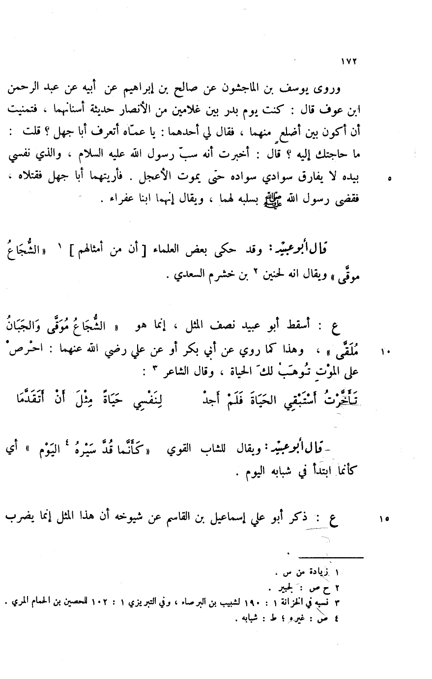 ع: أسقط أبو عبيد نصف المثل، إنما هو " الشجاع موقى والجبان ملقى "، وهذا كما روي عن أبي بكر أو عن علي رضي الله عنهما: احرص على الموت توهب لك الحياة، وقال الشاعر (3) :