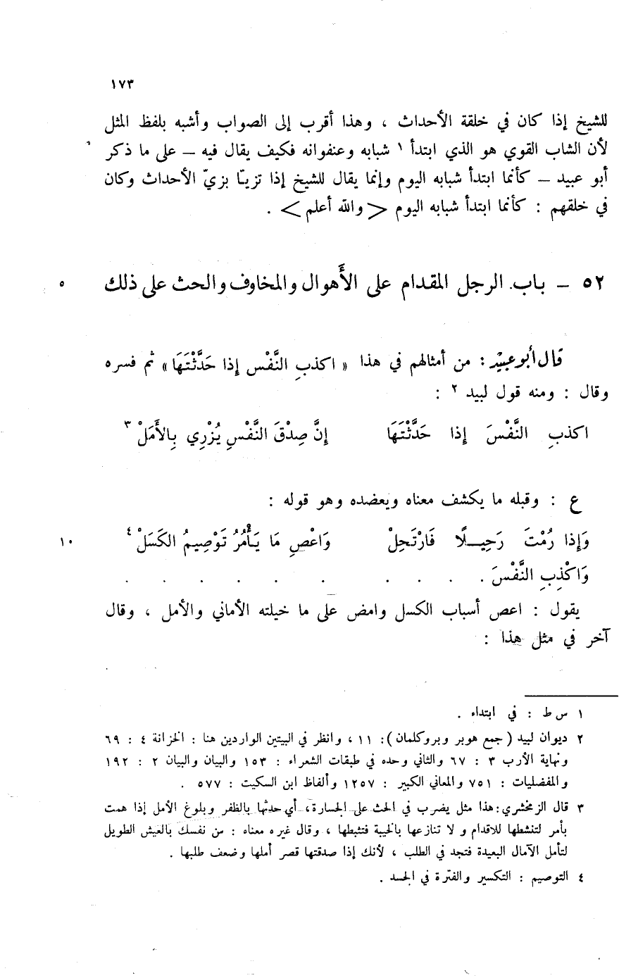قال أبو عبيد: من أمثالهم في هذا " اكذب النفس إذا حدثتها " ثم فسره وقال: ومنه قول لبيد (2) :
