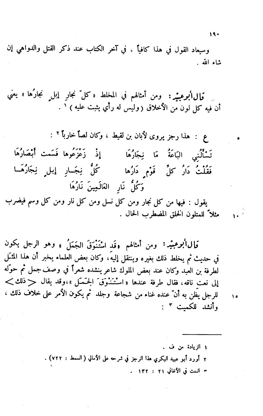 قال أبو عبيد: ومن أمثالهم " قد استنوق الجمل " وهو الرجل يكون في حديث ثم يخلط ذلك بغيره وينتقل إليه، وكان بعض العلماء يخبر أن هذا المثل لطرفة بن العبد وكان عند بعض الملوك شاعر ينشده شعراً في وصف جمل ثم حوله إلى نعت ناقه، فقال طرفة عندها " استنوق الجمل "، وقد يقال للرجل يظن به أن عنده غناء من شجاعة وجلد ثم يكون الأمر على خلاف ذلك، وأنشد للكميت (3) :