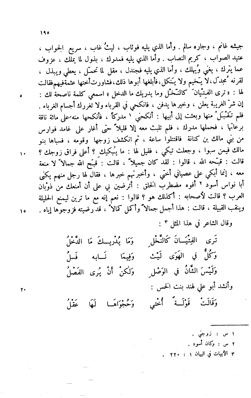 جيشه غانم، وجاره سالم، وأما الذي يليه فوثاب، ليث غاب، سريع الجواب، عتيد الصواب، كريم النصاب. وأما الذي يليه فمدرك، بذول لما يملك، عزوف عما يترك، يغني ويهلك، وأما الذي يليه فجندل، مقل لما تحمل، يعطي ويبذل، لقرنه مجدل، لا يخيم ولا ينكل، فأبلغها أبوها ذلك، فشاورت أختها عثمة فيهم فقالت لها: " ترى الفتيان كالنخل وما يدريك ما الدخل " اسمعي كلمة ناصحة لك: إن شر الغريبة يعلن، وخيرها يدفن، فانكحي في القرباء ولا تغررك أجسام الغرباء. فلم تقبل منها وبعثت إلى أبيها: أنكحني (1) مدركاً، فأنكحها منه على مائة ناقة برعاتها، فحملها مدرك، فلم تلبث معه إلا قليلاً حتى أغار على غامد فوارس من بني مالك بن كنانة فاقتتلوا ساعة، ثم انكشف زوجها وقومه، فسباها بنو مالك فيمن سبوا، وجعلت تبكي، فقيل لها: ما يبكيك؟ أعلى فراق زوجك؟ قالت: قبحه الله، قالوا: لقد كان جميلاً، قالت: قبح الله جمالاً لا منعة معه، إنما أبكي عصياني أختي، وأخبرتهم خبرها، فقال لها رجل منهم يكنى أبا نواس أسود (2) أفوه مضطرب الخلق: أترضين بي على أن أمنعك من ذؤبان العرب؟ قالت لأصحابه: أكذلك هو؟ قالوا: نعم إنه مع ما ترين ليمنع الحليلة وينقب القبيلة، قالت: هذا أجمل جمالاً وأكمل كمالاً، قد رضيته فزوجوها إياه.