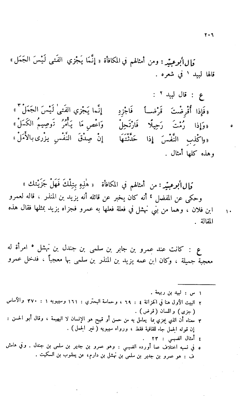 قال أبو عبيد: ومن أمثالهم في المكافأة " إنما يجزي الفتى ليس الجمل " قالها لبيد (1) في شعره.