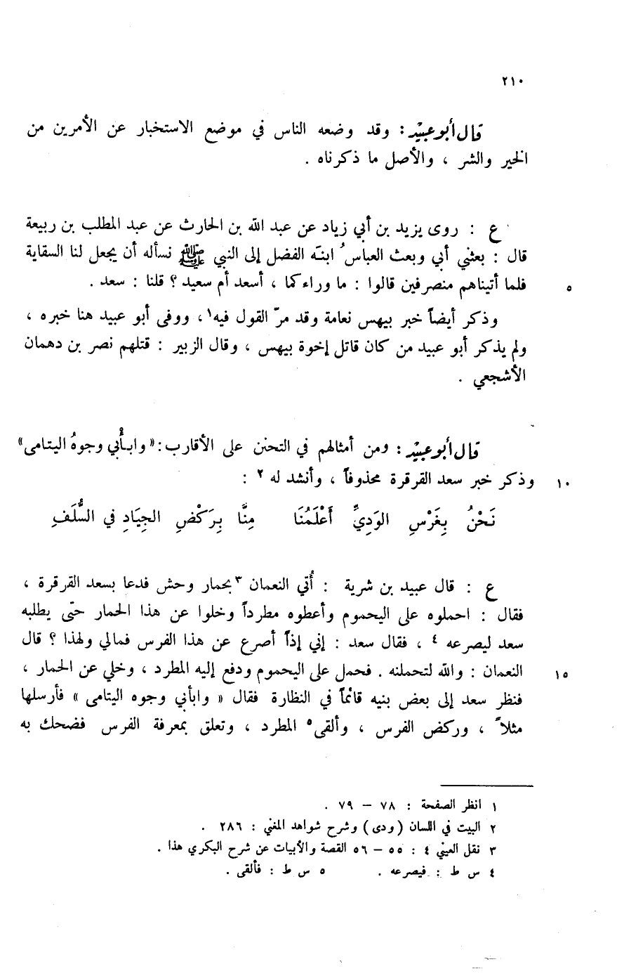 نحن بغرس الودي أعلمنا ... منا بركض الجياد في السلف ع: قال عبيد بن شرية: أتي النعمان (3) بحمار وحش فدعا بسعد القرقرة، فقال: احملوه على اليحموم وأعطوه مطرداً وخلو عن هذا الحمار حتى يطلبه سعد ليصرعه (4) ، فقال سعد: إني إذاً أصرع عن هذا الفرس فمالي ولهذا؟ قال النعمان: والله لتحملنه. فحمل على اليحموم ودفع إليه المطرد، وخلي عن الحمار، فنظر سعد إلى بعض بنيه قائماً في النظارة فقال " وابأبي وجوه اليتامى " فأرسلها مثلاً، وركض الفرس، وألقى (5) المطرد، وتعلق بمعرفة الفرس فضحك به