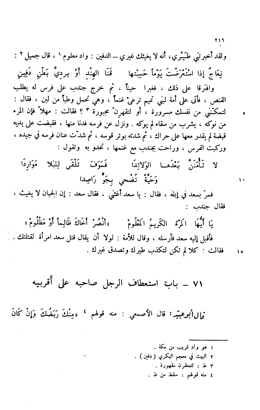 يا أيها المرء الكريم المعلوم ... " انصر أخاك ظالماً أو مظلوم " فأقبل إليه سعد فأرسله، وقال للأمة: لولا أن يقال قتل سعد امرأة لقتلتك. فقالت: كلا لم تكن لتكذب طيرك وتصدق غيرك.