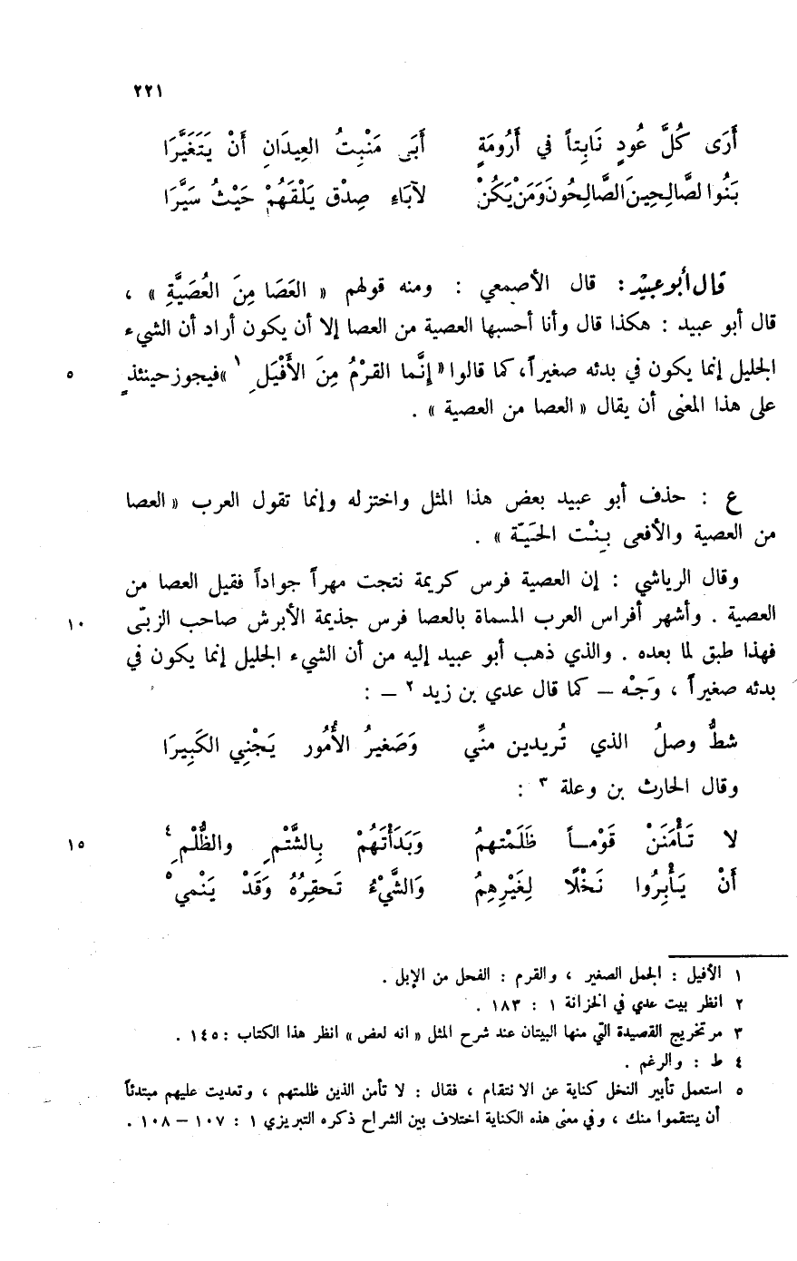 وقال الرياشي: إن العصية فرس كريمة نتجت مهراً جواداً فقيل العصا من العصية. وأشهر أفراس العرب المسماة بالعصا فرس جذيمة الأبرش صاحب الزبى فهذا طبق لما بعده. والذي ذهب أبو عبيد إليه من أن الشيء الجليل إنما يكون في بدئه صغيراً، وجه؟ كما قال عدي بن زيد (2) -: