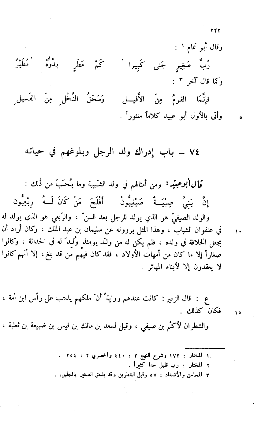 (3) المحاسن والأضداد: 57 وقبل الشطرين " قد يلحق الصغير بالجليل ".