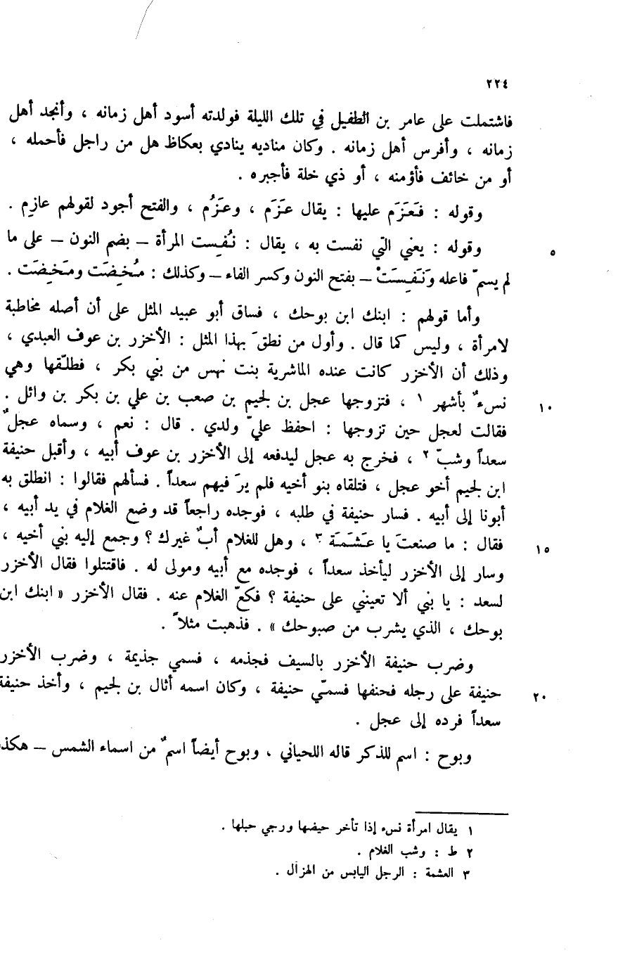 وأما قولهم: ابنك ابن بوحك، فساق أبو عبيد المثل على أن أصله مخاطبة لامرأة، وليس كما قال. وأول من نطق بهذا المثل: الأخزر بن عوف العبدي، وذلك أن الأخزر كانت عنده الماشرية بنت نهس من بني بكر، فطلقها وهي نسيء بأشهر (1) ، فتزوجها عجل بن لجيم بن صعب بن علي بن بكر بن وائل. فقالت لعجل حين تزوجها: احفظ علي ولدي. قال: نعم، وسماه عجل سعداً وشب (2) ، فخرج به عجل ليدفعه إلى الأخزر بن عوف أبيه، وأقبل حنيفة ابن لجيم أخو عجل، فتلقاه بنو أخيه فلم ير فيهم سعداً. فسألهم فقالوا: انطلق به أبونا إلى أبيه. فسار حنيفة في طلبه، فوجده راجعاً قد وضع الغلام في يد أبيه، فقال: ما صنعت يا عشمة (3) ، وهل للغلام أب غيرك؟ وجمع إليه بني أخيه، وسار إلى الأخزر ليأخذ سعداً، فوجده مع أبيه ومولى له. فاقتلوا فقال الأخزر لسعد: يا بني ألا تعينني على حنيفة؟ فكع الغلام عنه. فقال الأخزر " ابنك ابن بوحك، الذي يشرب من صبوحك ". فذهبت مثلاً.