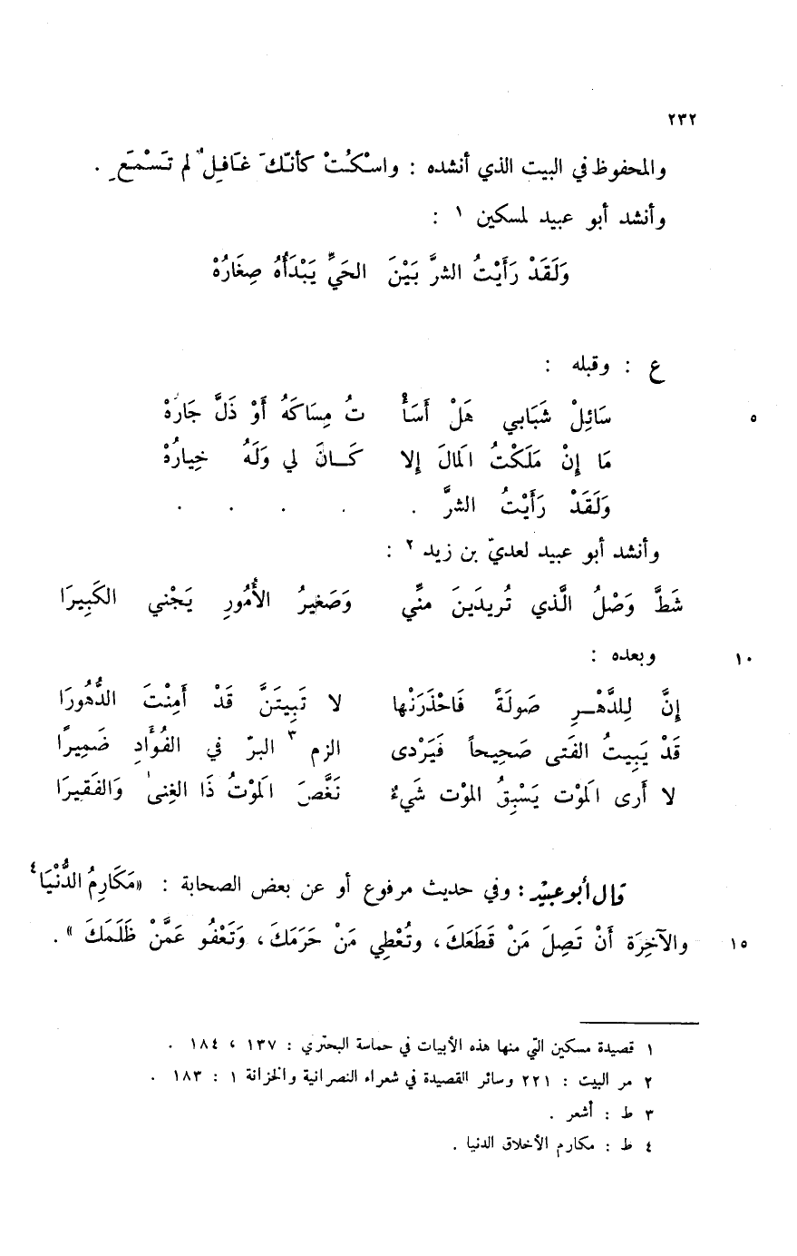 لا أرى الموت يسبق شيء ... نغص الموت ذا الغنى والفقيرا قال أبو عبيد: وفي حديث مرفوع أو عن بعض الصحابة: " مكارم الدنيا (4) والآخرة أن تصل من قطعك، وتعطي من حرمك، وتعفو عمن ظلمك ".