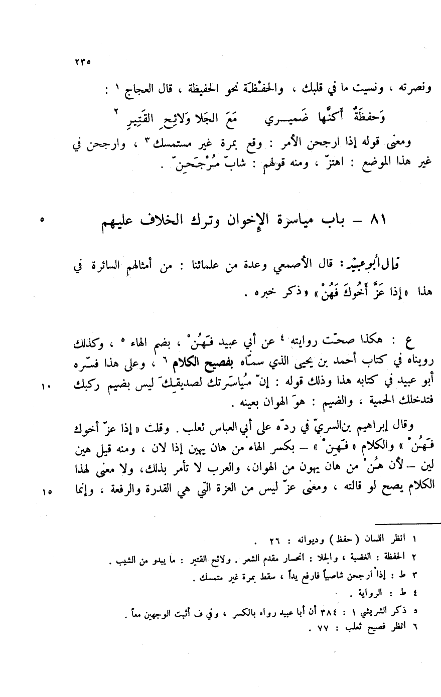 ع: هكذا صحت روايته (4) عن أبي عبيد فهن، بضم الهاء (5) ، وكذلك رويناه في كتاب أحمد بن يحيى الذي سماه بفصيح الكلام (6) ، وعلى هذا فسره أبو عبيد في كتابه هذا وذلك قوله: إن مياسرتك لصديقك ليس بضيم ركبك فتدخلك الحمية، والضيم: هو الهوان بعينه.