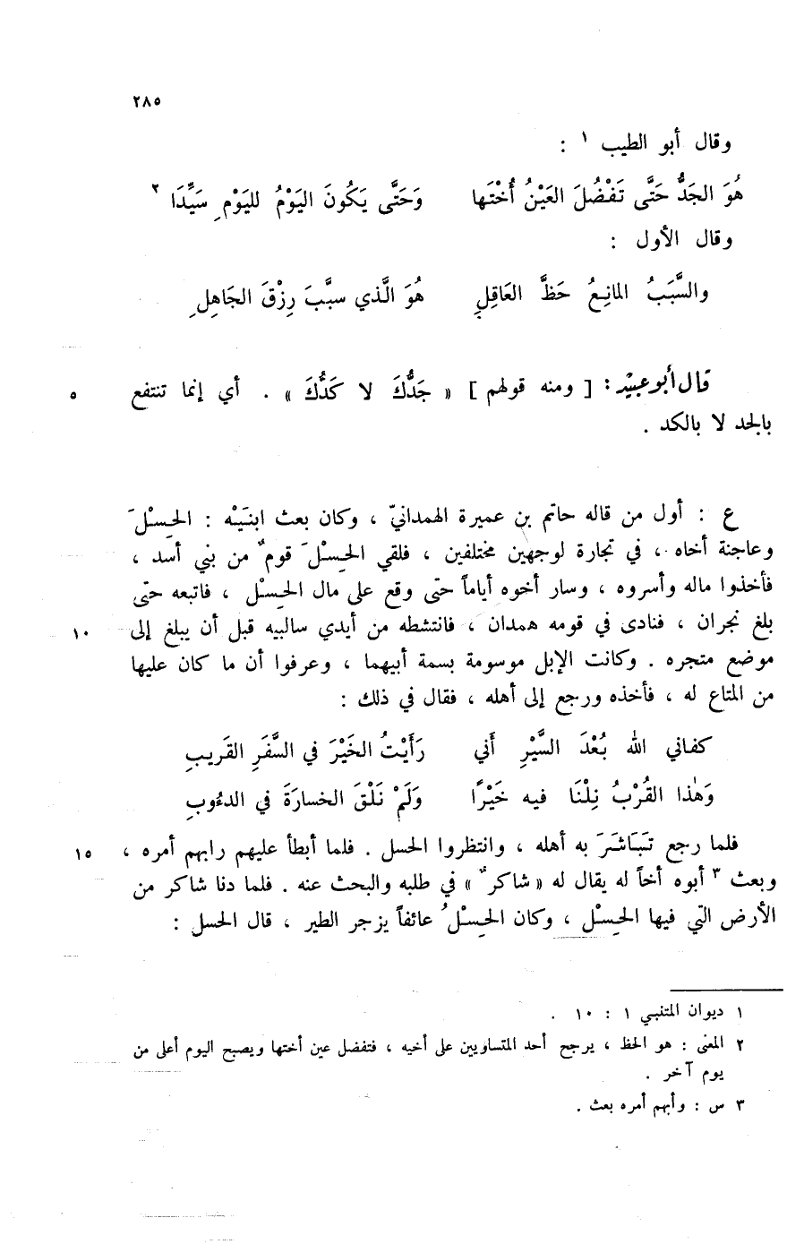 والسبب المانع حظ العاقل ... هو الذي سبب رزق الجاهل قال أبو عبيد: [ومنه قولهم] " جدك لا كدك ". أي إنما تنتفع بالجد لا بالكد.