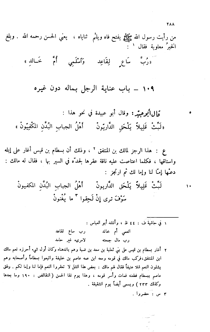 " رب ساعٍ لقاعد ... واسلمي أم خالد " 109؟ باب عناية الرجل بماله دون غيره