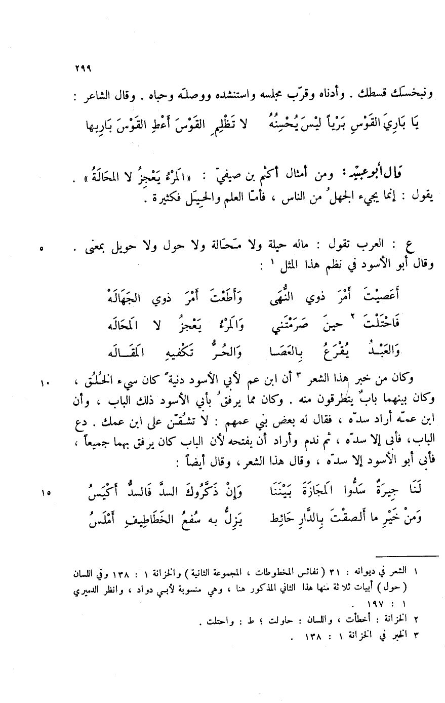 (1) الشعر في ديوانه: 31 (نفائس المخطوطات، المجموعة الثانية) والخزانة 1: 138 وفي اللسان (حول) أبيات ثلاثة منها هذا الثاني المذكور هنا، وهي منسوبة لأبي داود، لوانظر الدميري 1: 197.