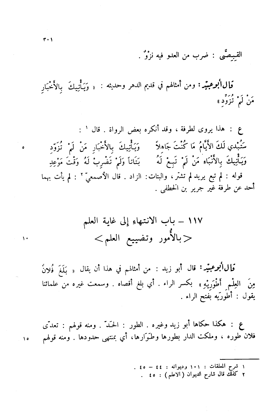قال أبو عبيد: ومن أمثالهم في قديم الدهر وحديثه: " ويأتيك بالأخبار من لم تزود ".