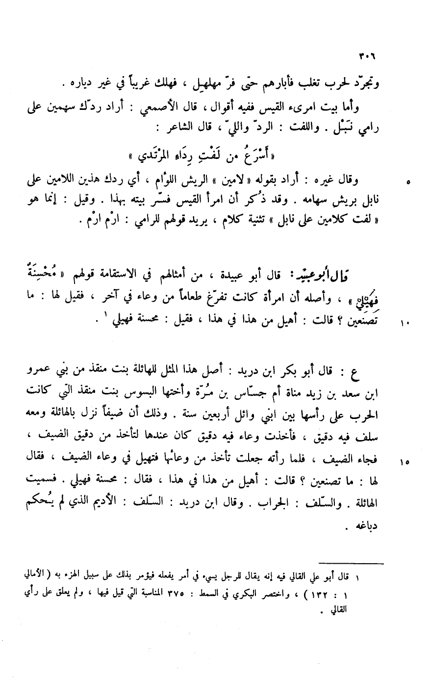 " أسرع من لفت رداء المرتدي " ... وقال غيره: أراد بقوله " لامين " الريش اللؤم، أي ردك هذين اللامين على نابل بريش سهامه. وقد ذكر أن امرأ القيس فسر بيته بهذا. وقيل: إنما هو " لفت كلامين على نابل " تثنية كلام، يريد قولهم للرامي: ارم ارم.