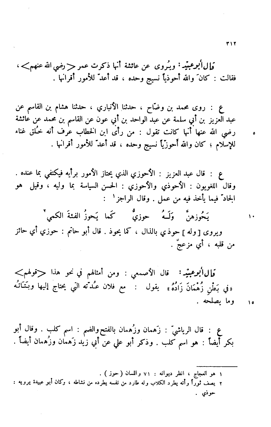 ع: قال عبد العزيز: الأحوزي الذي يحتاز الأمور برأيه فيكتفي بما عنده. وقال اللغويون: الأحوذي والأحوزي: الحسن السياسة وبما وليه، وقيل هو الجاد فيما يأخذ فيه من عمل. وقال الراجز (1) :