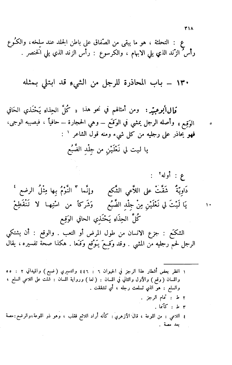 (1) انظر بعض أشطار هذا الرجز في الحيوان 6: 446 والدميري (ضبع) والميداني 2: 55 واللسان (وقع) والأول والثاني في اللسان: (لعا) ورواةي اللسان: شتت على اللاعي السلع، والسلع: هو الذي تسلعت رجله، أي تشققت.