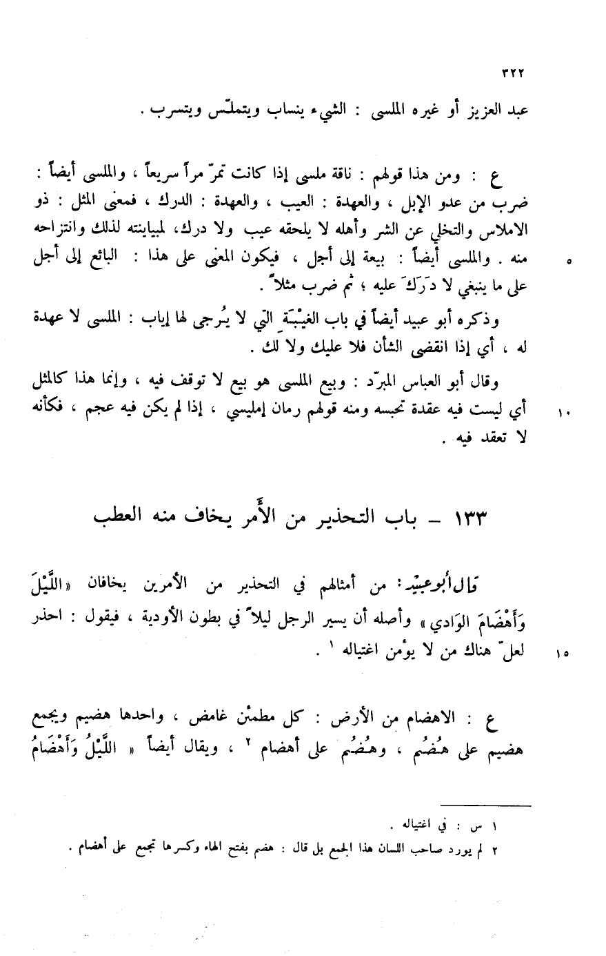 قال أبو عبيد: من أمثالهم في التحذير من الأمرين يخافان " الليل وأهضام الوادي " وأصله أن يسير الرجل ليلاً في بطون الأودية، فيقول: أحذر لعل هناك من لا يؤمن اغتياله (1) .