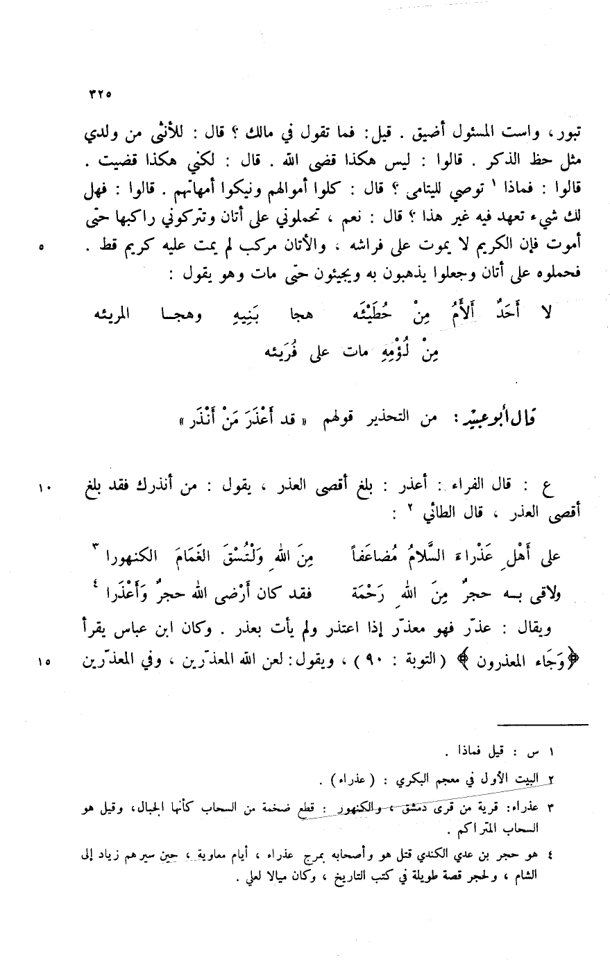 ولاقى به حجر من الله رحمة ... فقد كان أرضى الله حجر وأعذرا (4) ويقال: عذر فهو معذر إذا اعتذر ولم يأت بعذر. وكان ابن عباس يقرأ {وجاء المعذرون} (التوبة: 90) ، ويقول: لعن الله المعذرينن وفي المعذرين