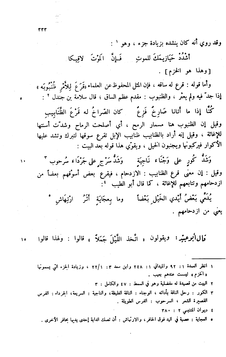 وشد كورٍ على وجناء ناجيةٍ ... وشد سرجٍ على جرداء سرحوب (3) وقيل: إن معنى قرع الظنابيب: الازدحام، فيقرع بعض أسؤقهم بعضاً من ازدحامهم وتتابعهم للإغاثة، كما قال أبو الطيب (4) :