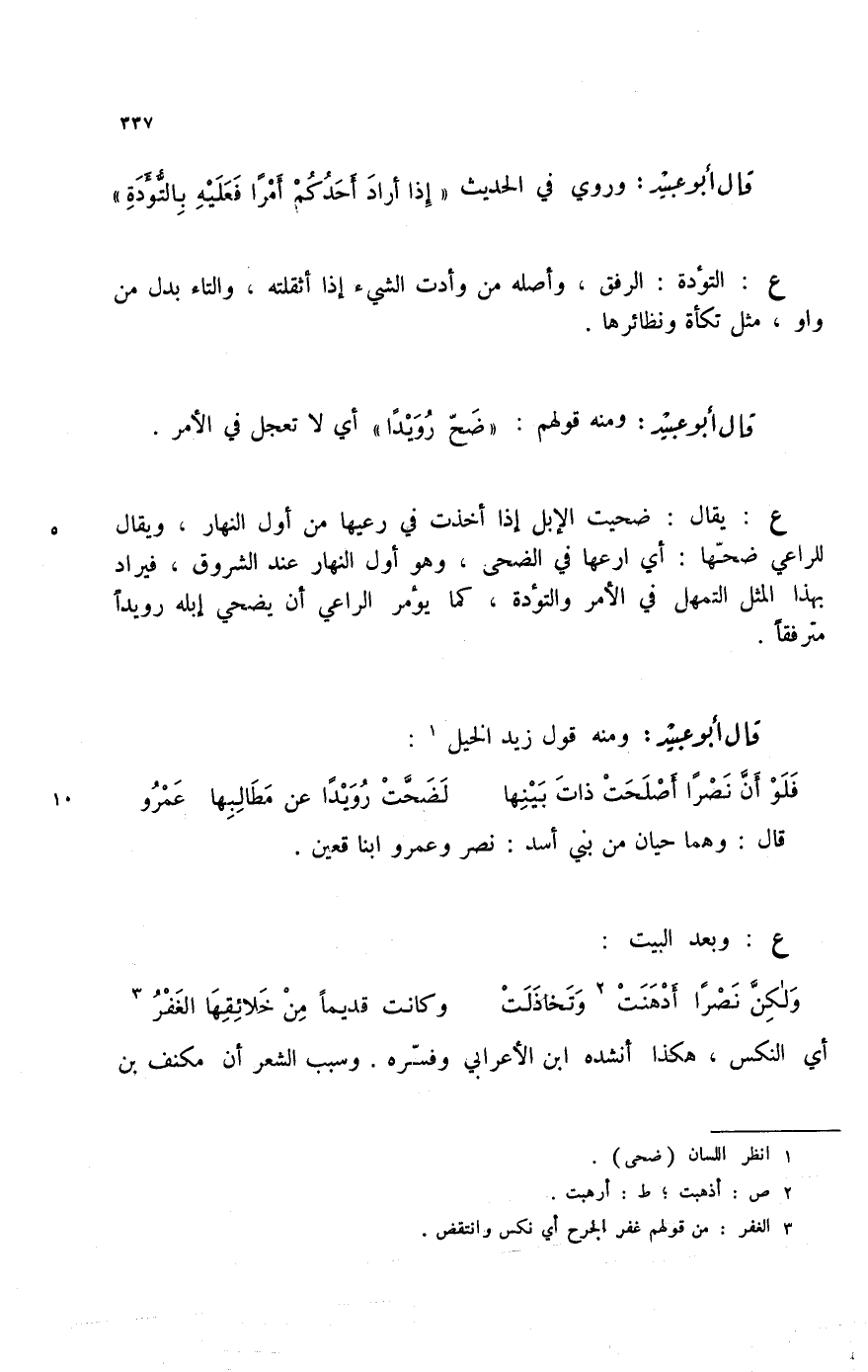 قال أبو عبيد: ومنه قولهم: " ضح رويداً " أي لا تعجل في الأمر.