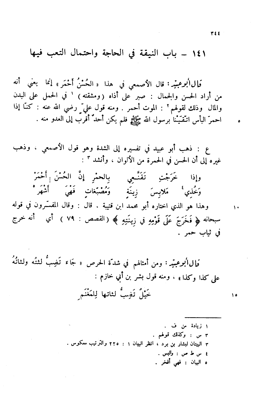 قال أبو عبيد: قال الأصمعي في هذا " الحسن أحمر " إنما يعني أنه من أراد الحسن والجمال: صبر على أذاه (ومشقته) (1) في الحمل على البدن والمال وذلك لقولهم (2) : الموت أحمر. ومنه قول علي رضي الله عنه: كنا إذا احمر البأس اتقينا برسول الله صلى الله عليه وسلم فلم يكن أحد أقرب إلى العدو منه.