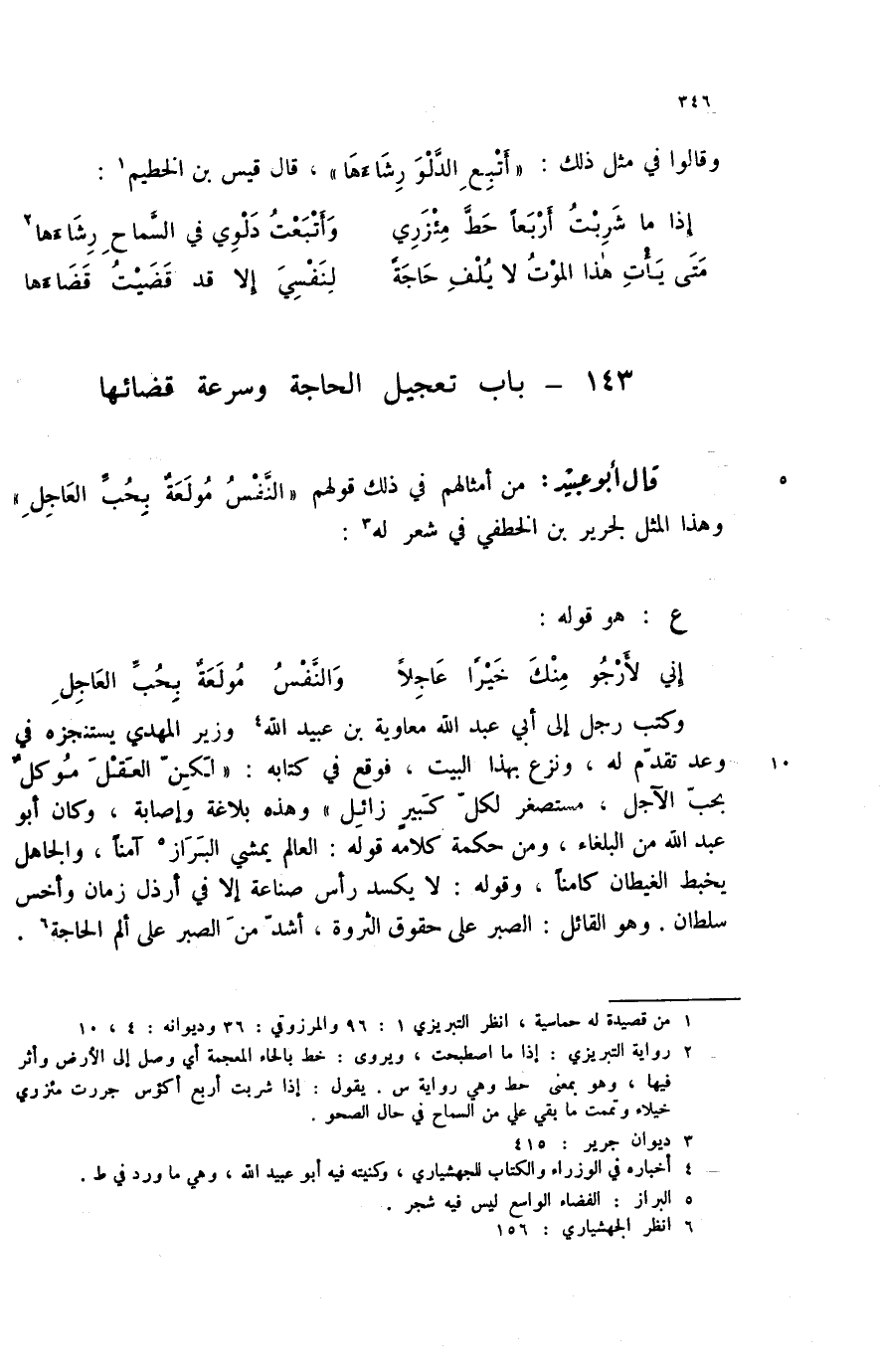 قال أبو عبيد: من أمثالهم في ذلك قولهم " النفس مولعة بحب العاجل " وهذا المثل لجرير بن الخطفي في شعر له (3) :