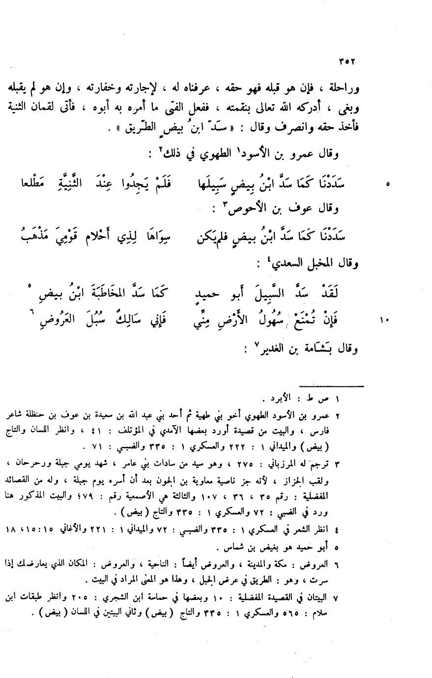 (2) عمرو بن الأسود الطهوي أخو بني طهية ثم أحد بني عبد الله بن سعيدة بن عوف بن حنظلة شاعر فارس، والبيت من قصيدة أورد بعضها الآمدي في المؤتلف: 41، وانظر اللسان والتاج (بيض) والميداني 1: 222 والعسكري 1: 335 والضبي: 71.