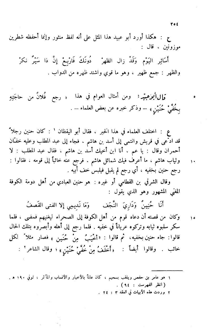 ع: اختلف العلماء في هذا الخبر، فقال أبو اليقظان (1) : كان حنين رجلاً قد ادعى في قريش وانتمى إلى أسد بن هاشم، فجاء إلى عبد المطلب وعليه خفان أحمران وقال: يا عم، أنا ابن أخيك أسد بن هاشم، فقال عبد المطلب: لا وثياب هاشم، ما أعرف فيك شمائل هاشم، فرجع عنه خائباً إلى قومه، فقالوا: رجع حنين بخفيه، أي رجع لم يقبل فيلبس خف أبيه.
