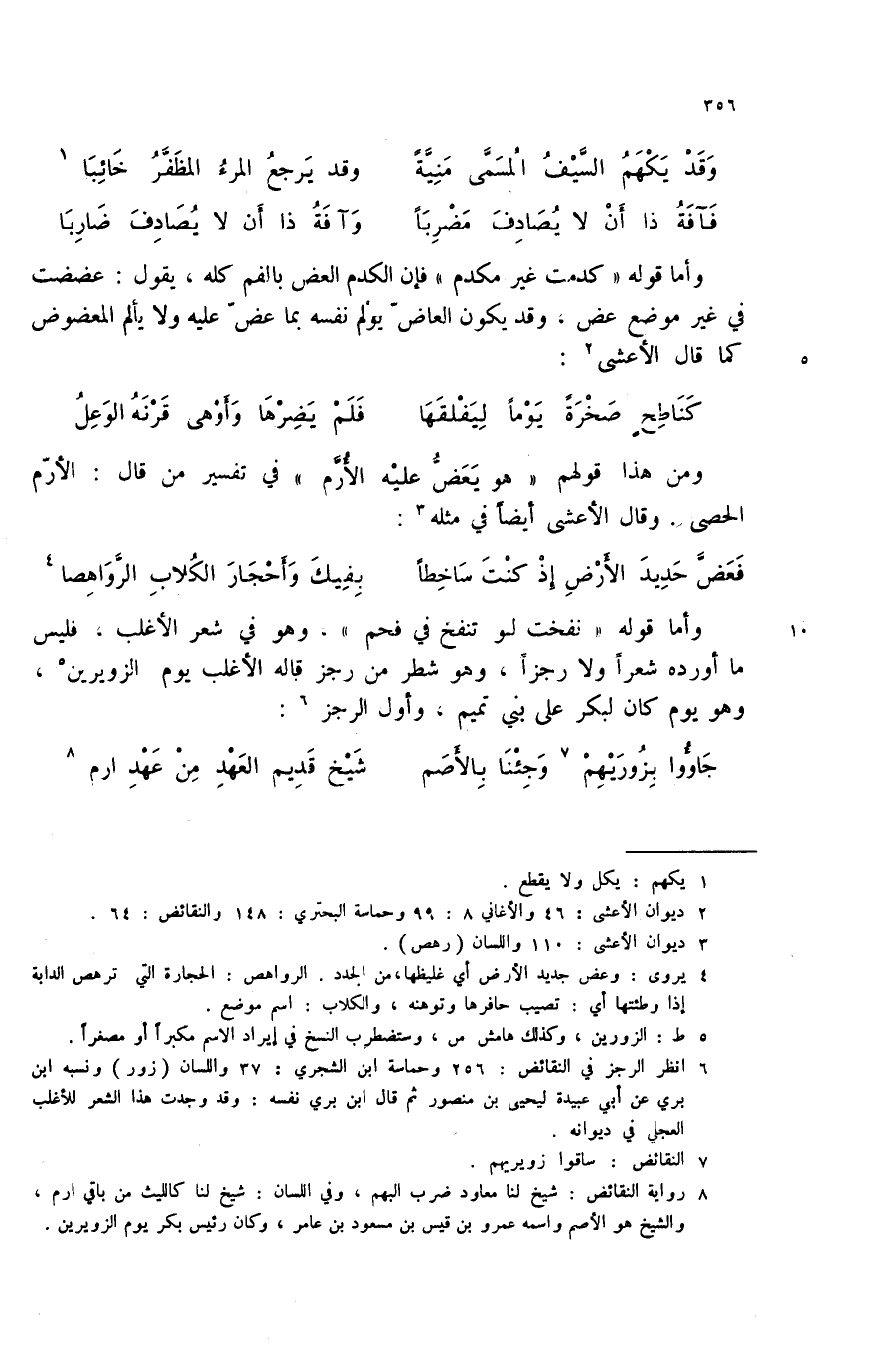 (8) رواية النقائض: شيخ لنا معاود ضرب إليهم، وفي اللسان: شيخ لنا كالليث من باقي ارم، والشيخ هو الأصم واسمه عمرو بن قيس بن مسعود بن عامر، وكان رئيس بكر يوم الزويرين.