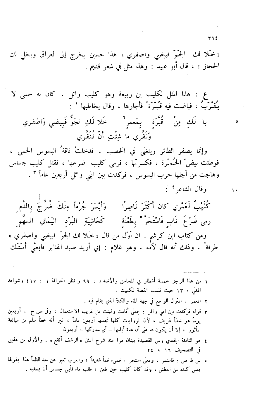(2) يا لك من قبرة بمعمر ... خلا لك الجو فبيضي واصفري ونقري ما شئت أن تنقري ... وإنما يصفر الطائر ويتغنى في الخصب، فدخلت ناقة البسوس الحمى، فوطئت بيض الحمرة، فكسرتهان فرمى كليب ضرعها، فقتل كليب جساس وهاجت من أجلها حرب البسوس، فركدت بين ابني وائل أربعين عاماً (3) .