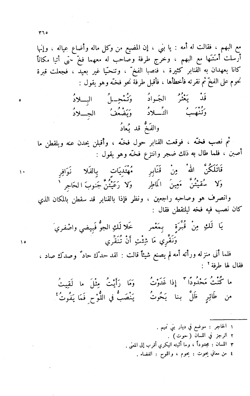 مع البهم، فقالت له أمه: يا بني، إن المضيع من وكل ماله وأضاع عياله، وإنها أرسلت أمتها مع البهم، وخرج طرفة وصاحب له معهما فخ حتى أتيا مكاناً كانا يعهدان به القنابر كثيرة، فنصبا الفخ، وتنحيا غير بعيد، فجعلت قبرة تحوم على الفخ فأخطأها، فأقبل طرفة نحو فخه وهو يقول: