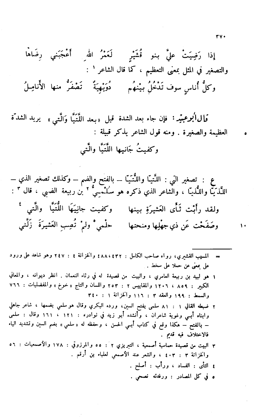 وكفيت جانيها اللتيا والتي ... ع: تصغير التي: اللتيا واللتيا؟ بالفتح والضم؟ وكذلك تصغير الذي؟ اللذيا واللذيا، والشاعر الذي ذكره هو سلمي (2) بن ربيعة الضبي، قال (3) :
