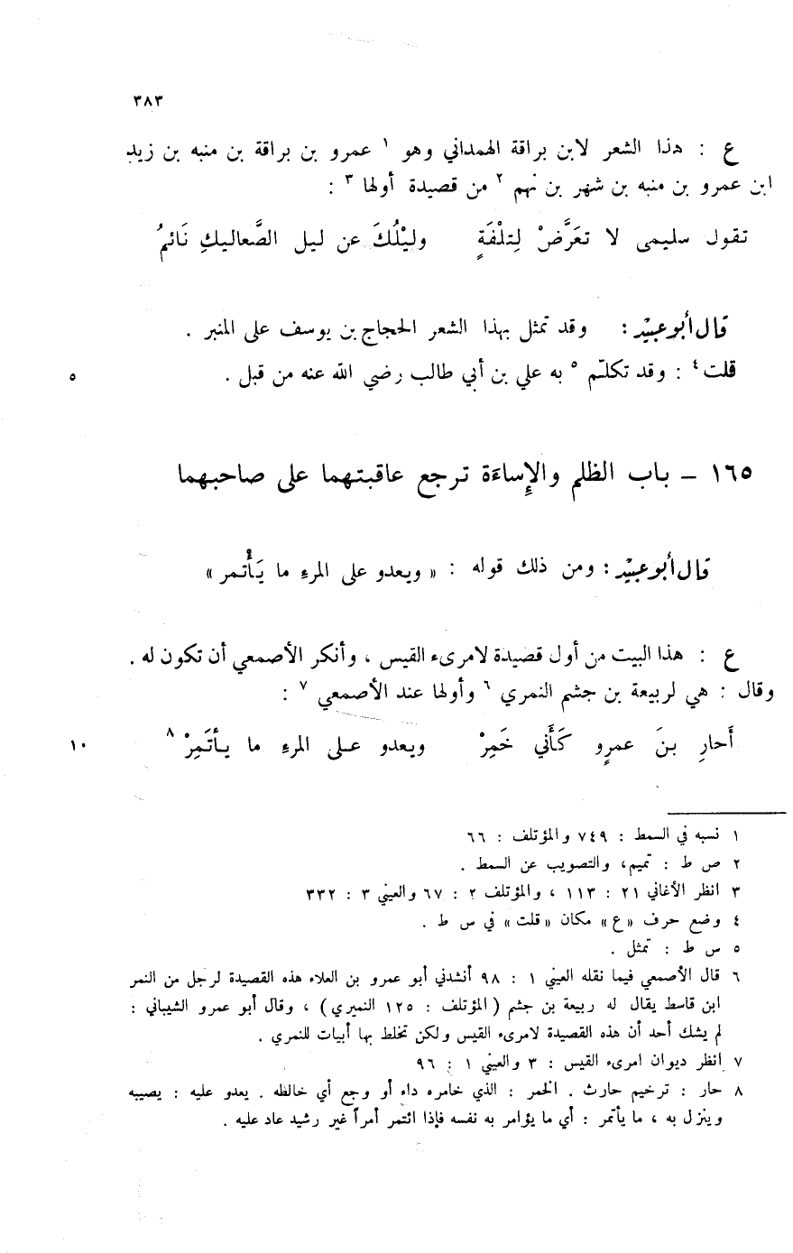 (8) حار: ترخيم حارث. الخمر: الذي خامره داء أو وجع أي خالطه. يعدو عليه: يصيبه وينزل به، ما يأتمر: أي ما يؤامر به نفسه فإذا ائتمر أمراً غير رشيد عاد عليه.