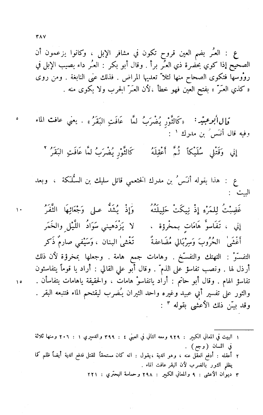 أغشى الحروب وسربالي مضاعفة ... تغشى البنان، وسفي صارم ذكر التفسؤ: التهتك والتفسخ. وهامات جمع هامة. وجعلها بمخرؤة لأن ذلك أرذل لها. ونصب تفاسؤ على الذم. وقال أبو علي القالي: أراد يا قوماً يتفاسؤن تفاسؤ الهام. وقال أبو حاتم: أراد يا تفاسؤ هامات. والحقيقة ياهامات يتفاسأن. والثور على تفسير أبي عبيد وغيره واحد الثيران يضرب ليقتحم الماء فتتبعه البقر. وقد بين ذلك الأعشى بقوله (3) :
