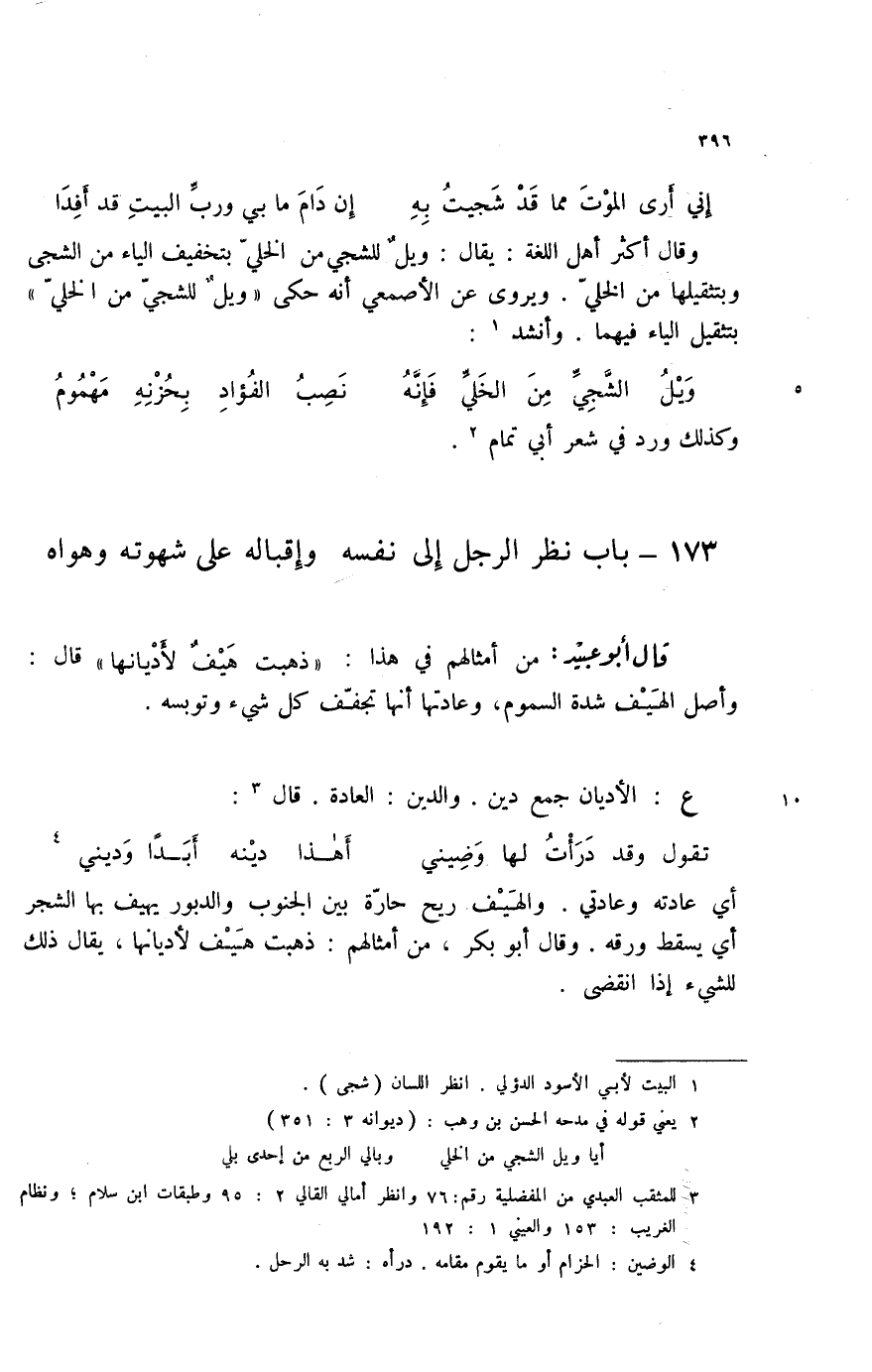إني أرى الموت مما قد شجيت به ... إن دام ما بي ورب البيت قد أفدا وقال أكثر أهل اللغة: يقال: ويل للشجي من الخلي بتخفيف الياء من الشجى وبتثقيلها من الخلي. ويروى عن الأصمعي أنه حكى " ويل للشجي من الخلي " بتثقيل الياء فيهما. وأنشد (1) :
