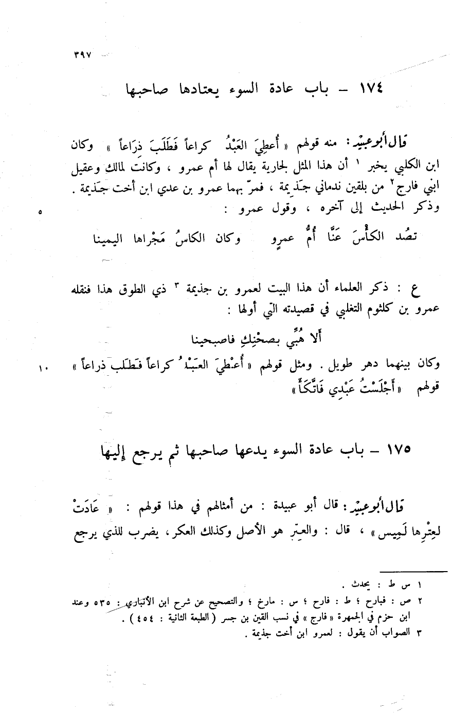 قال أبو عبيد: منه قولهم " أعطي العبد كراعاً فطلب ذراعاً " وكان ابن الكلبي يخبر (1) أن هذا المثل لجارية يقال لها أم عمرو، وكانت لمالك وعقيل ابني فارج (2) من بلقين ندماني جذيمة، فمر بهما عمرو بن عدي ابن أخت جذيمة وذكر الحديث إلى آخره، وقول عمرو: