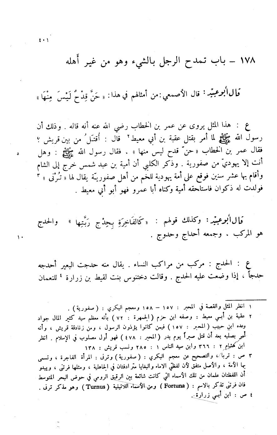 (3) ص: تربا، والتصحيح عن معجم البكري: (ًفورية) وترنى: المرأة الفاجرة، وتسمى بها الأمة، والأصل متفق لأن لفظتي الإماء والبغايا مترادفتان في الجاهلية، ومثلها فرتنى، ويبدو أن اللفظتان علمان من تلك الأسماء التي كانت شائعة بين الرقيق الرومي في حوض البحر المتوسط فإن فرتنى تذكر بالاسم: (Fortuna) ومن الأسماء اللاتينية (Turnus) وهو مذكر ترنى.