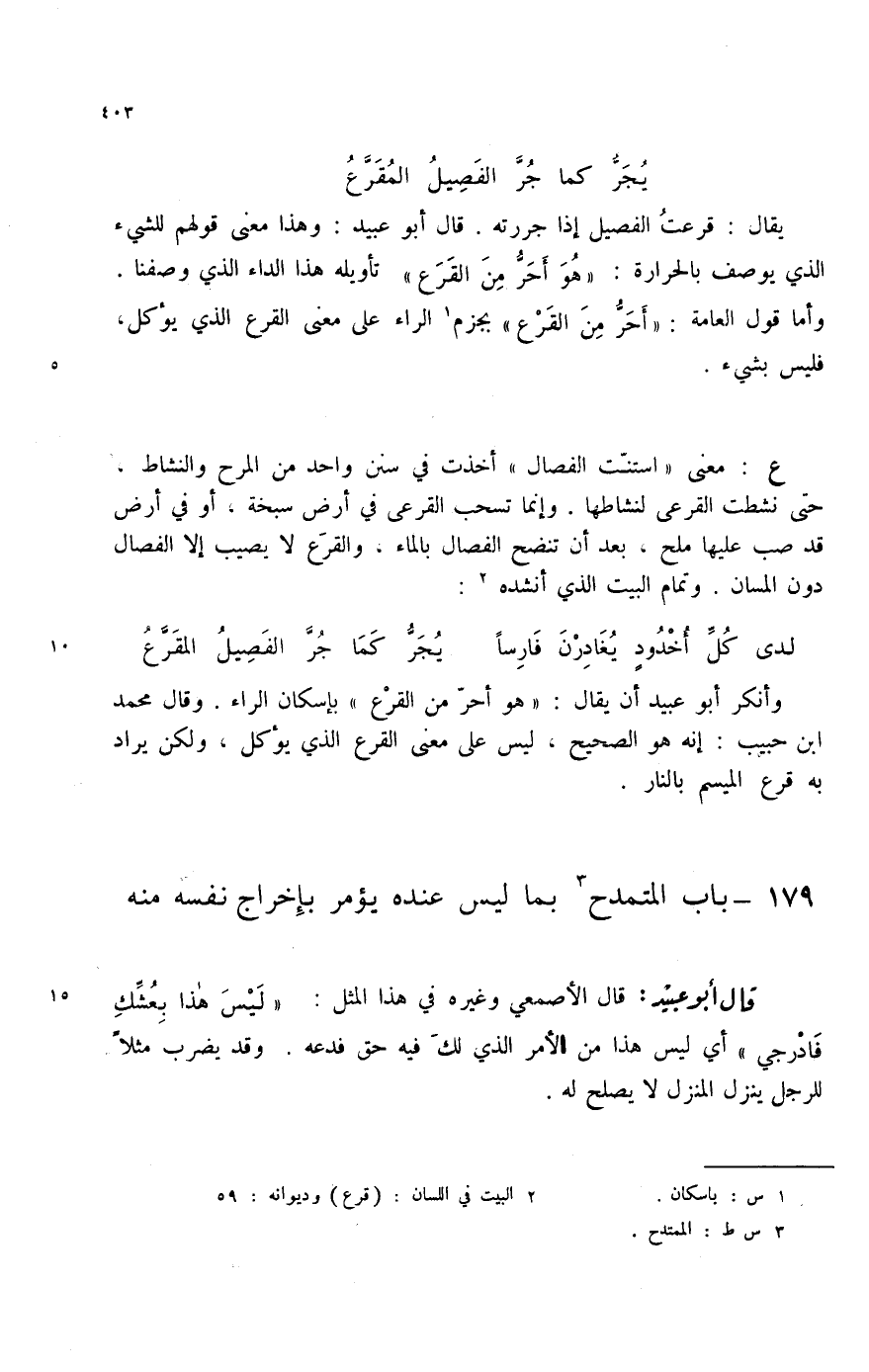 لدى كل أخدود يغادرن فارساً ... يجر كما جر الفصيل المقرع وأنكر أبو عبيد أن يقال: " هو أحر من القرع " بإسكان الراء. وقال محمد ابن حبيب: إنه هو الصحيح، ليس على معنى القرع الذي يؤكل، ولكن يراد بعه قراع الميسم بالنار.