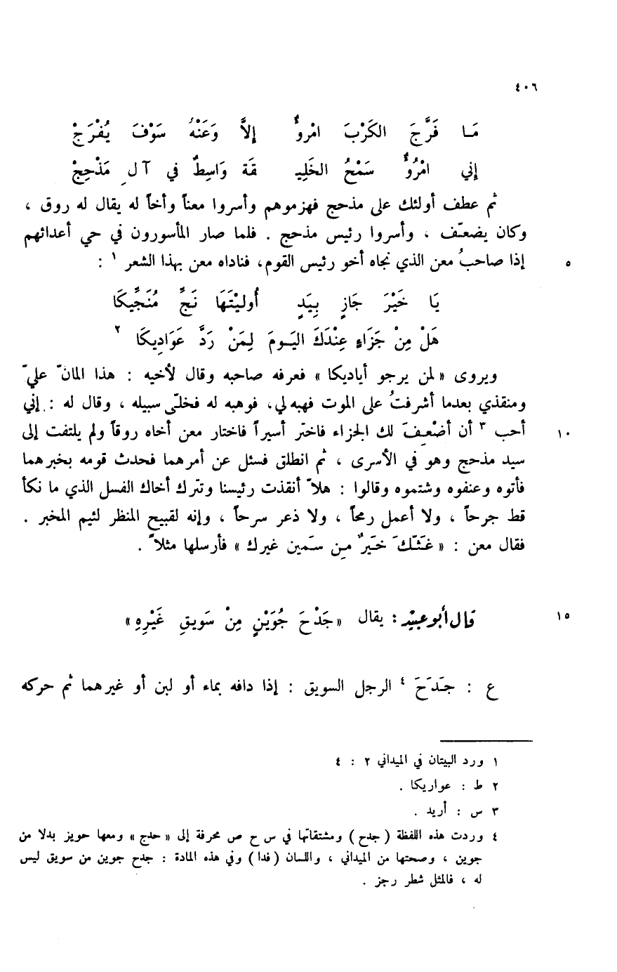 (4) وردت هذه اللفظة (جدح) ومشتقاتها في س ح ص محرفة إلى " حدج " ومعها حويز بدلا من جوين، وصحتها من الميداني، واللسان (فدا) وفي هذه المادة: جدح جوين من سويق ليس له، فالمثل شطر رجز.