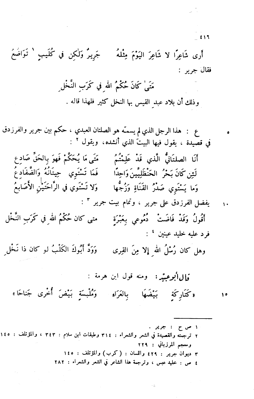 وما يستوي صدر القناة وزجها ... ولا تستوي في الراحتين الأصابع يفضل الفرزدق على جرير، وتمام بيت جرير (3) :