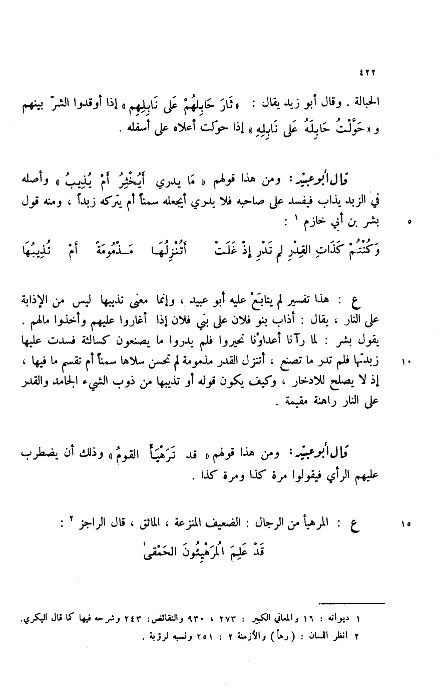 وكنتم كذات القيدر لم تدر إذ غلت ... أتنزلها مذمومة أم تذيبها ع: هذا تفسير لم يتابع عليه أبو عبيد، وإنما معنى تذيبها ليس من الإذابة على النار، يقال: أذاب بنو فلان على بني فلان إذا أغاروا عليهم وأخذوا مالهم. يقول بشر: لما رآنا تحيروا فلم يدروا ما يصنعون كسالئة فسدت عليها إذ لا يصلح ما تصنع، أتنزل القدر مذمومة لم تحسن سلاها سمناً أم تقسم ما فيها، إذ لا يصلح للادخار، وكيف يكون قوله أو تذيبها من ذوب الشيء الجامد والقدر على النار راهنة مقيمة.