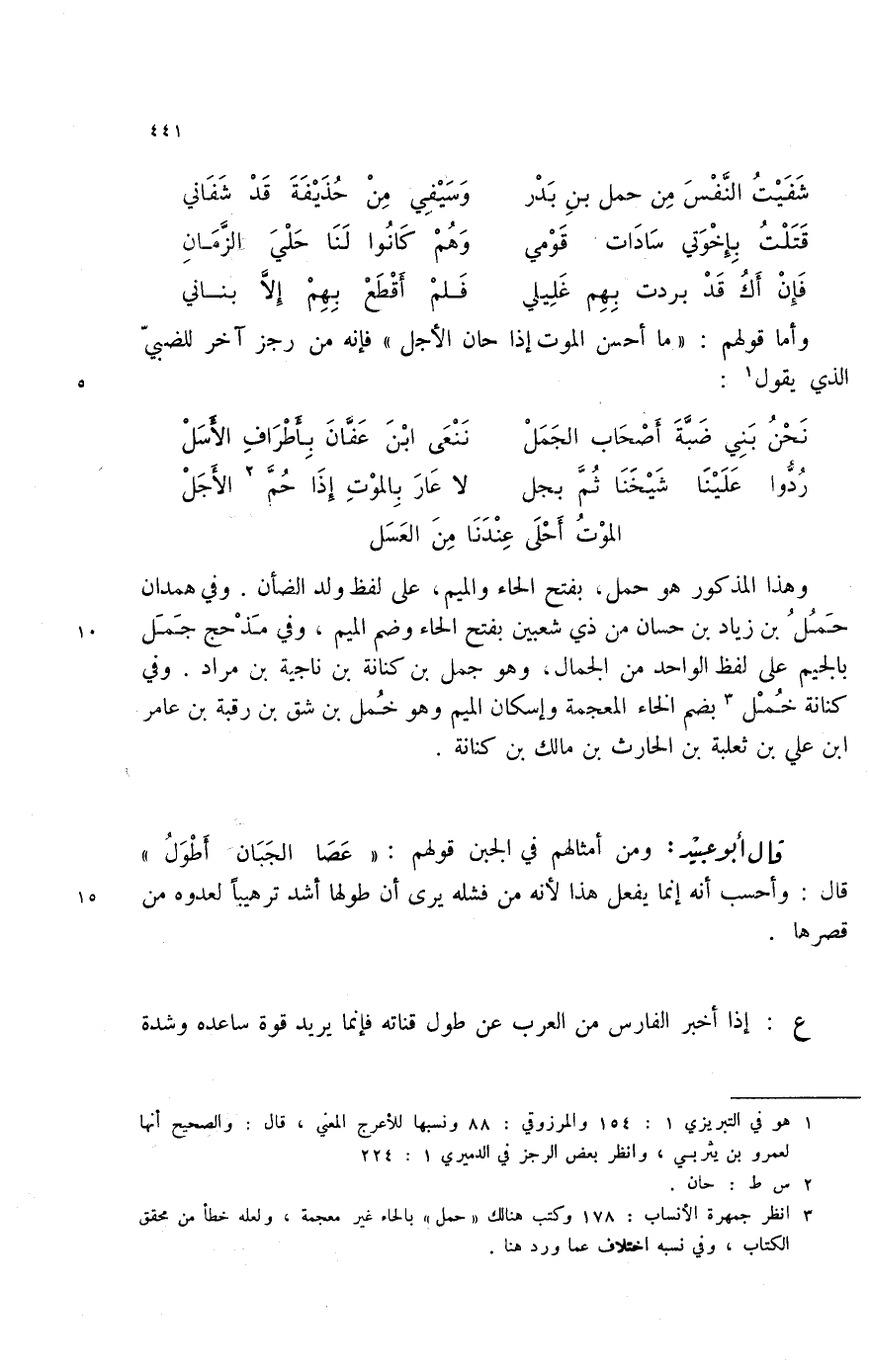 فإن أك قد بردت بهم غليلي ... فلم أقطع بهم إلا بناتي وأما قولهم: " ما أحسن الموت إذا حان " فإنه من رجز آخر للضبي الذي يقول (1) :