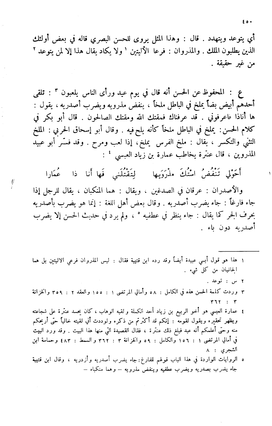 ع: المحفوظ عن الحسن أنه قال في يوم عيد ورأى الناس يلعبون (3) : تلقى أحدهم أبيض بضاص يملخ في الباطل ملخاً، ينفض مذرويه ويضرب أصدريه، يقول: ها أناذا فاعرفوني. قد عرفناك فمقتك الله ومقتك الصالحون. قال أبو بكر في كلام الحسن: يملخ في الباطل ملخاً كأنه يلح فيه. وقال أبو إسحاق الحربي: الملخ التثني والتكسر، يقال: ملخ، إذا لعب ومرح. وقد فسر أبو عبيد المذروين، قال عنترة يخاطب عمارة بن زياد العبسي (4) :
