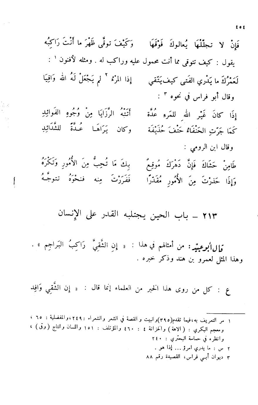 وإذا حذرت من الأمور مقدراً ... ففررت منه فنحوه تتوجه 213؟ باب الحين يجتلبه القدر على الإنسان