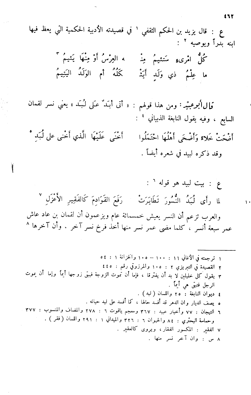 لما رأى لبد النسور تطايرت ... رفع القوادم كالفقير الأعزل (7) والعرب تزعم أن النسر يعيش خمسمائة عام ويزعمون أن لقمان بن عاد عاش عمر سبعة أنسر، كلما مضى عمر نسر منها أخذ فرخ نسر آخر، وأن آخرها (8)