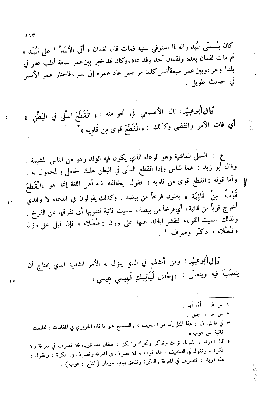 قال أبو عبيد: قال الأصمعي في نحو منه: " انقطع السلى في البطن " أي فات الأمر وانقضى وكذلك: " انقطع قوى من قاويه " (3)