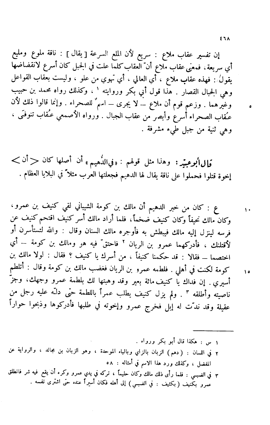 (3) في الضبي: فلما رأى ذلك مالك وكان حليماً، تركه في يدي عمرو وكره أن يقع فيه شر فانطلق عمرو بكنيف (بكثيف: في الضبي) إلى أهله فكان أسيراً عنده حتى اشترى نفسه.